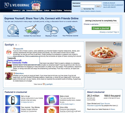 It was Blogger that hooked millions into blogging and launched the whole blogging phenomenon, not Live Journal. As someone who remembers in the beginning when blogging first became “big”, I just find it so odd that Live Journal is being credited for that.